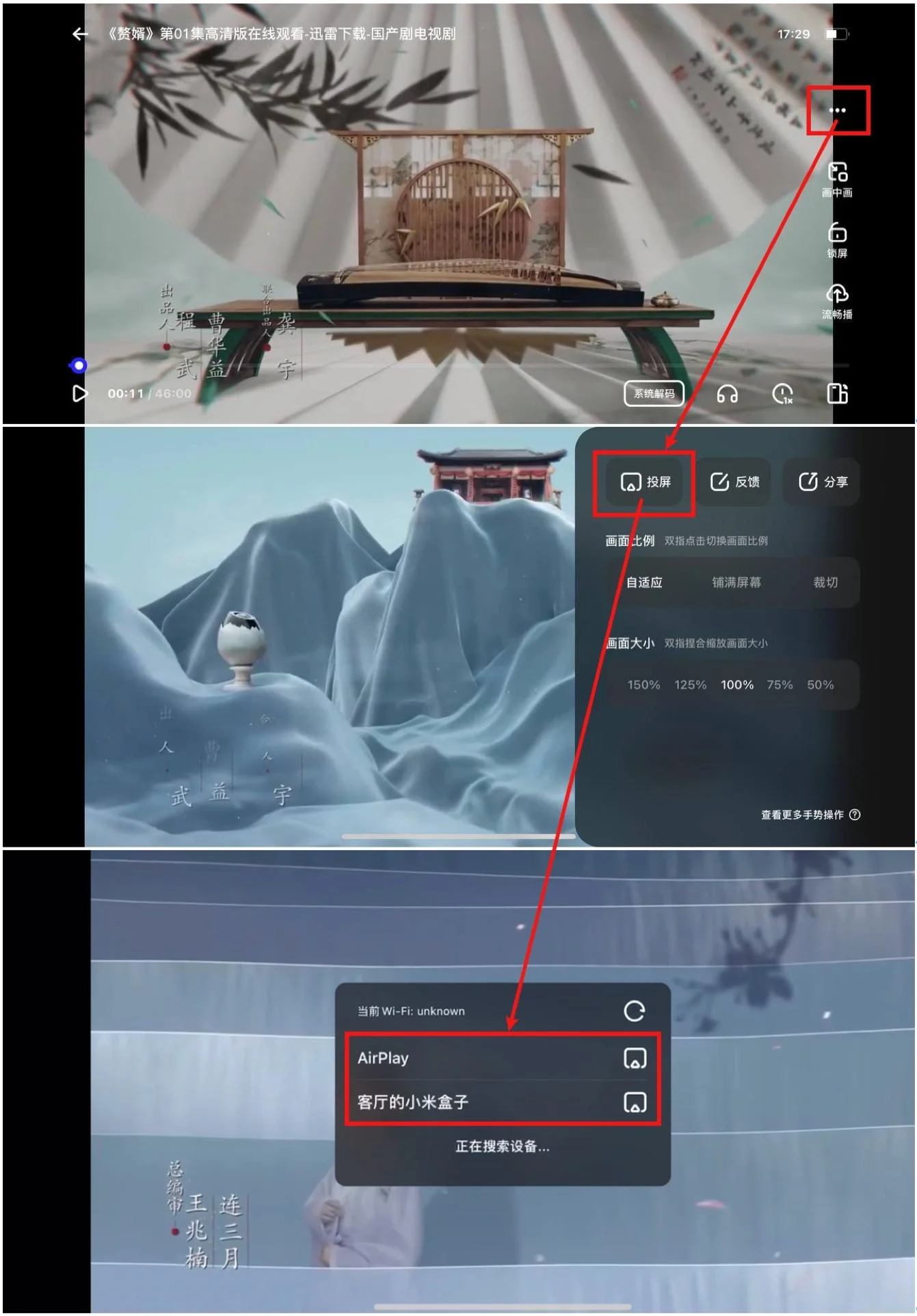 打开夸克浏览器->打开星源影视->播放视频->选择·····右上角 … ->投屏->等待搜寻出智能电视/电视盒子->选中,即可投屏。