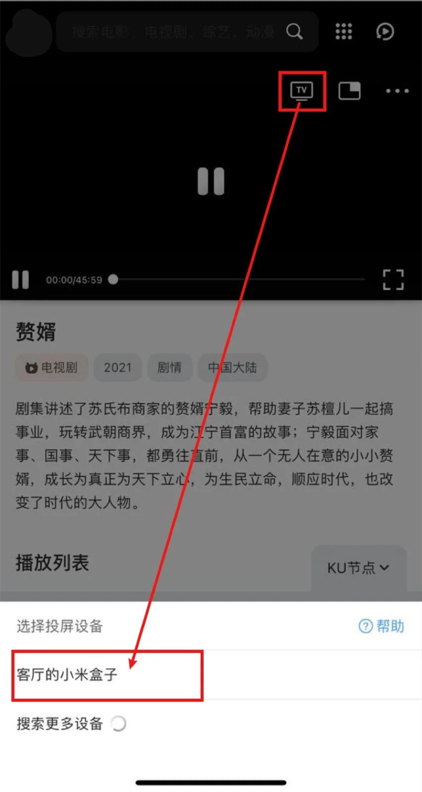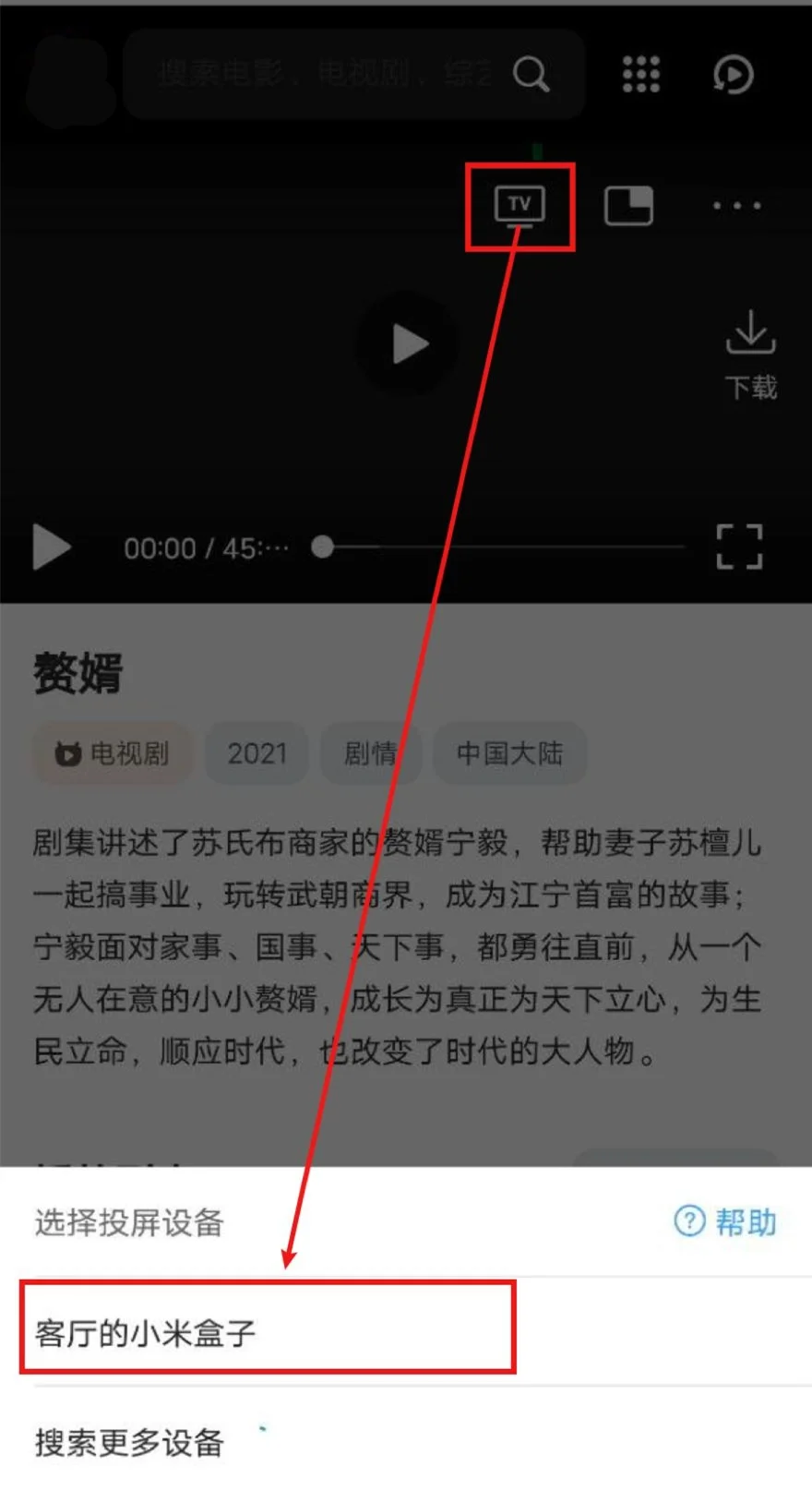 打开QQ浏览器(会接管网页播放器)->打开星源影视->播放视频->选中投屏图标->等待搜寻出智能电视/电视盒子->选中,即可投屏。